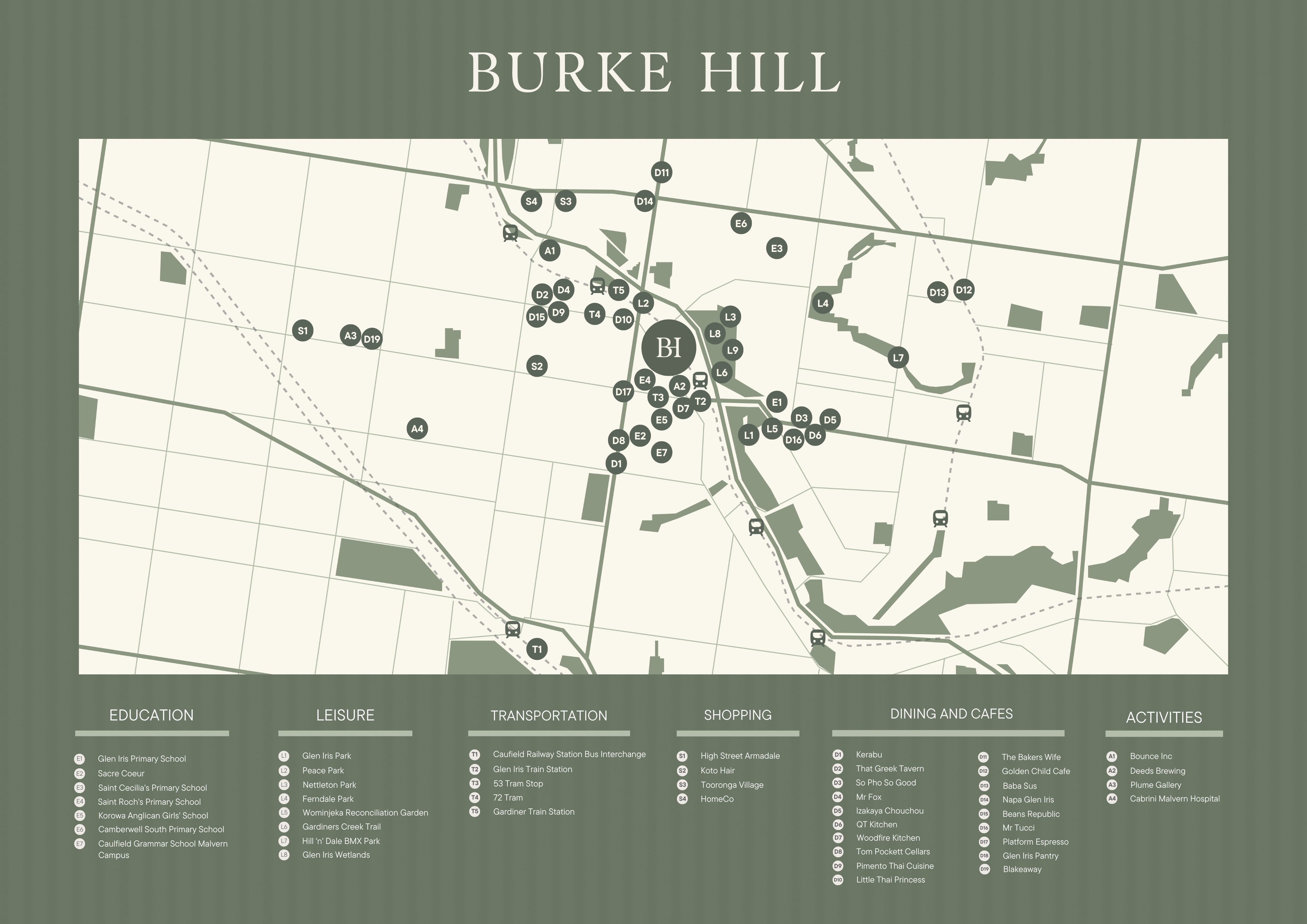 Our Burke Hill project is strategically located just a mere 10km from the bustling CBD. Embellished with picturesque parks, chic cafes and top-notch restaurants, you will never run out of things to do. With some of Melbourne's finest educational institutions right around the corner, the possibilities for growth and learning are endless. At Glen Iris, everything you need is within reach, allowing you to relish the little things in life.